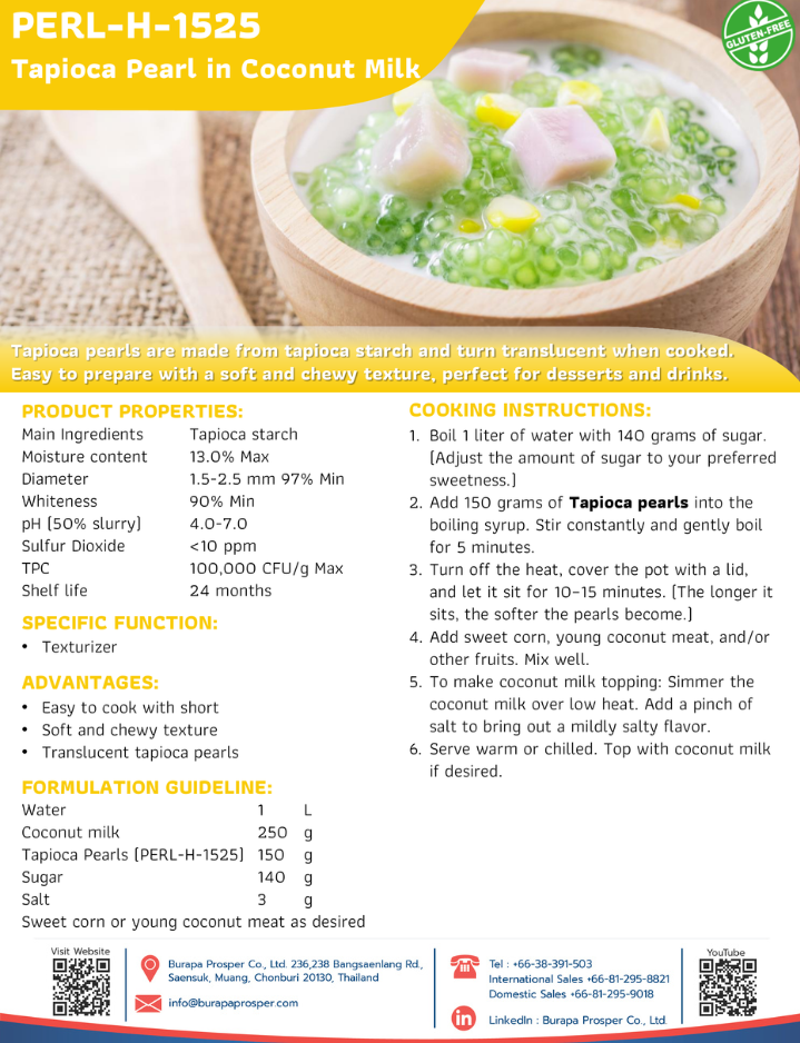 From a professional operational perspective, these pearls offer superior performance by minimizing clumping and maintaining their chewy texture even after extended holding times. This consistency allows high-volume kitchens and catering services to prepare large batches with confidence, knowing the pearls will retain their perfect mouthfeel and glossy finish without clouding the coconut milk base. Naturally gluten-free and crafted for uniform results, our tapioca pearls are the preferred choice for chefs and food manufacturers who refuse to compromise on the delicate balance of texture and presentation in their dessert offerings.