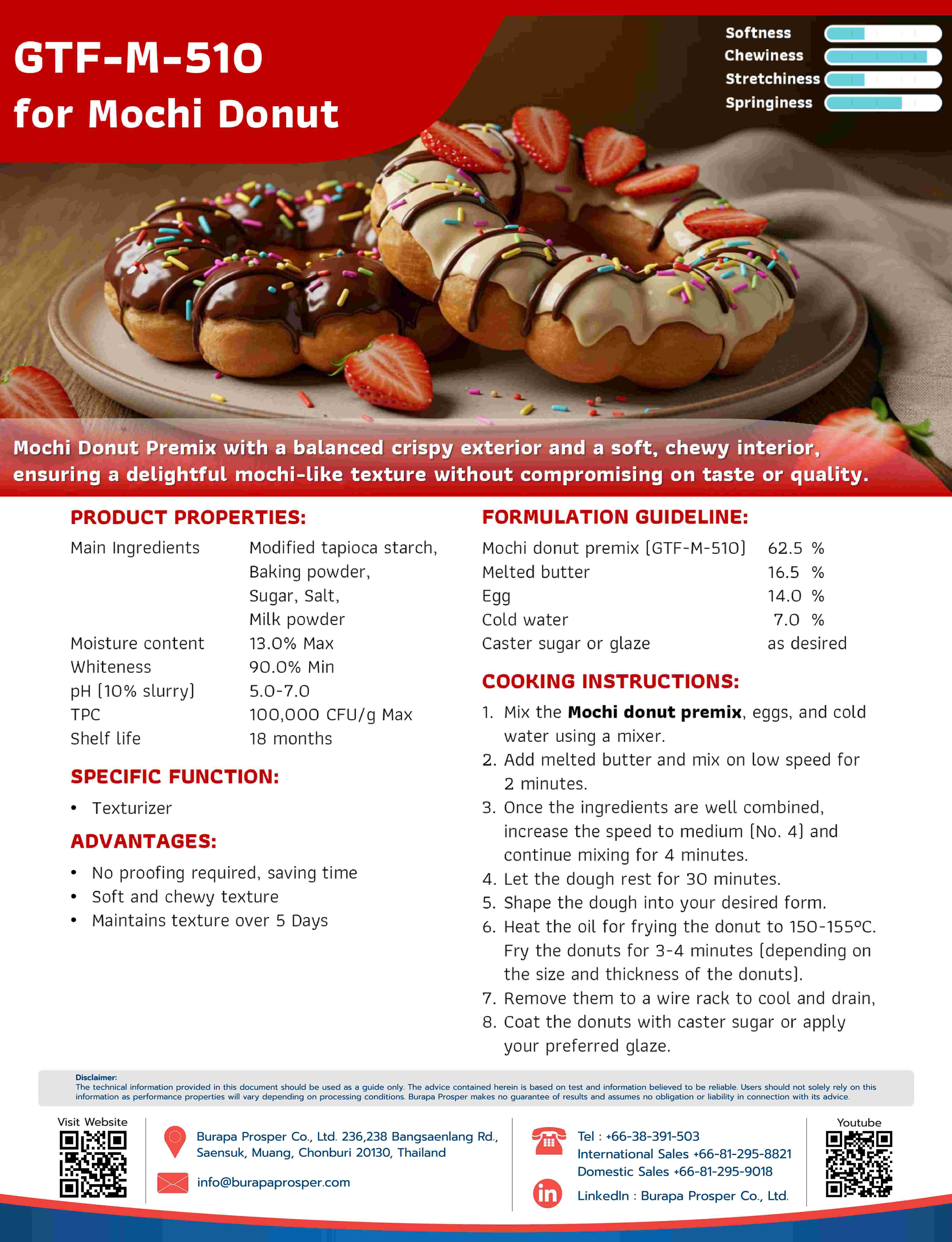 Mochi donuts are a fast-growing category because they offer a distinctly different bite from regular donuts: a thin, crispy exterior with a soft, chewy “mochi” interior that today’s consumers love. The challenge for operators is delivering that texture consistently in every piece and every batch while keeping production efficient. Mochi Donut Premix was developed precisely for this—producing donuts that are crispy outside and soft–chewy inside, without dough proofing, and retaining texture for up to 5 days.